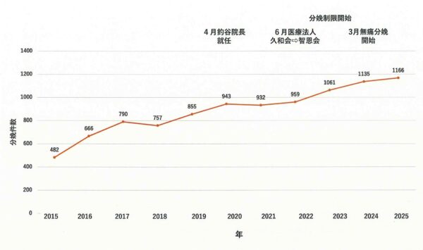| 年 | 当院出生数(人) | 当院帝王切開数(人) | 予定帝王切開数(人) | 緊急帝王切開数(人) | 花山ママクリニック帝王切開率(%) | 無痛分娩数(人) |
